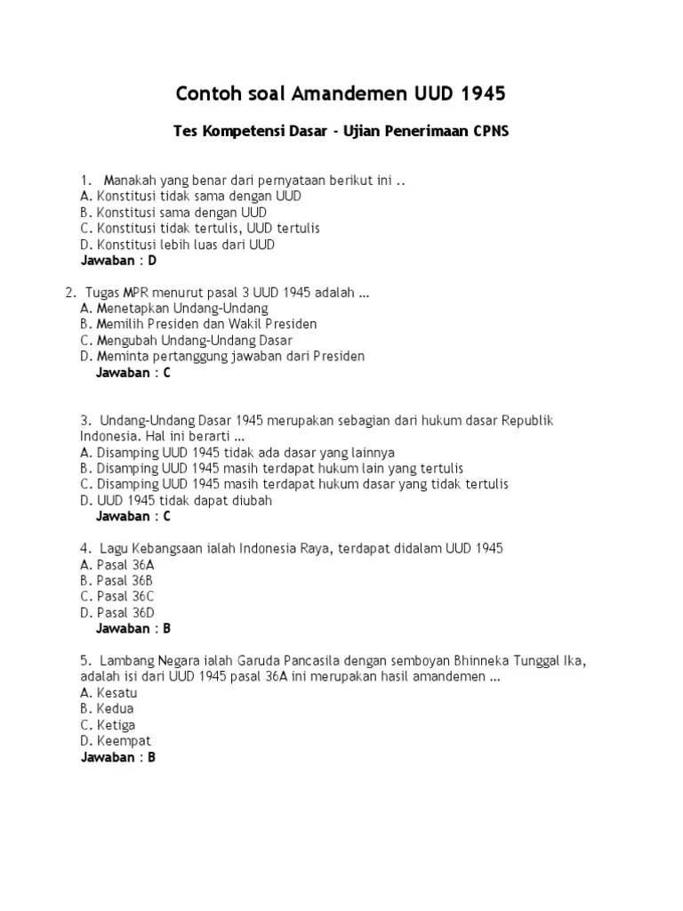 Soal Tes Cpns Uud 45 : Contoh Soal Amandemen Uud 1945 Tes Kompetensi Dasar Ujian Penerimaan Cpns Pdf - Tes tersebut terdiri dari soal seputar pancasila, uud 1945, bhinneka tunggal ika, dan negara kesatuan republik indonesia.
