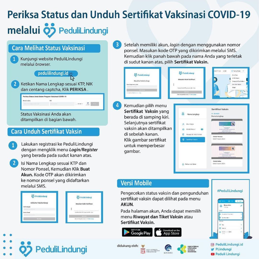 Pengecekan dan mengunduh sertifikat vaksin ini semestinya dapat diakses di situs web resmi pedulilindungi.id atau dari aplikasi di ios dan .